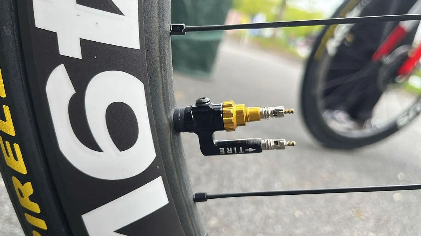 Um detalhe técnico que merece atenção: as duas válvulas coaxiais compartilham o mesmo furo no aro. O mecânico consegue calibrar a pressão do inserto e a pressão do pneu separadamente, no mesmo ponto, com um manômetro comum. Isso significa que a equipe pode ajustar o setup para diferentes setores ou diferentes condições de pista sem precisar remover o pneu — algo que, no contexto de uma corrida de sete horas com trinta setores de pavé, tem valor operacional claro.