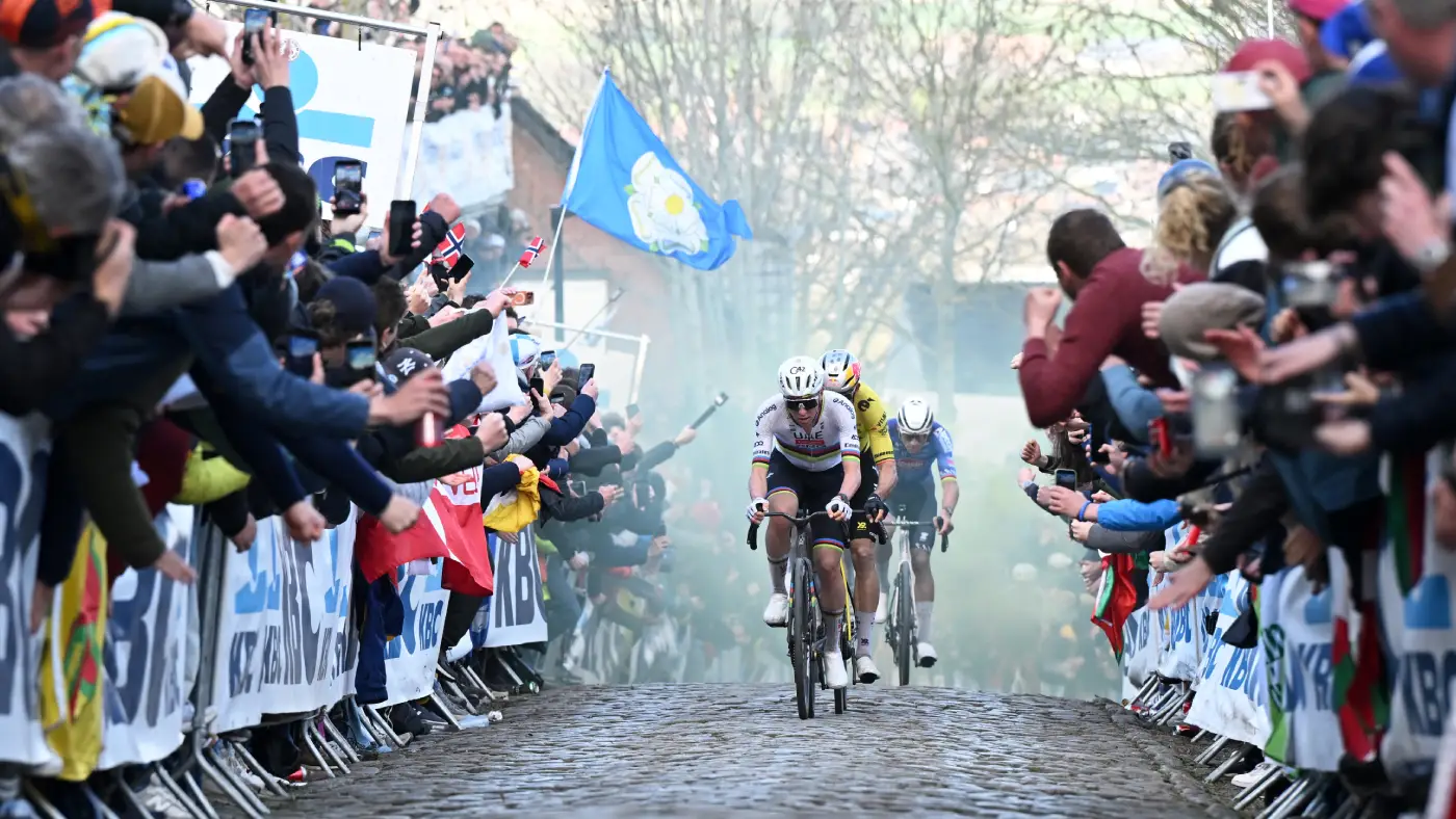 Pogačar despachou Remco Evenepoel — estreante em clássicas de paralelepípedos, impressionante terceiro colocado — no Paterberg. Depois isolou Van der Poel na última escalada do Kwaremont e chegou sozinho em Oudenaarde. Terceira vitória na corrida, recorde igualado. Décimo segundo Monumento. Van der Poel chamou o rival de “fenômeno” e ninguém discordou.